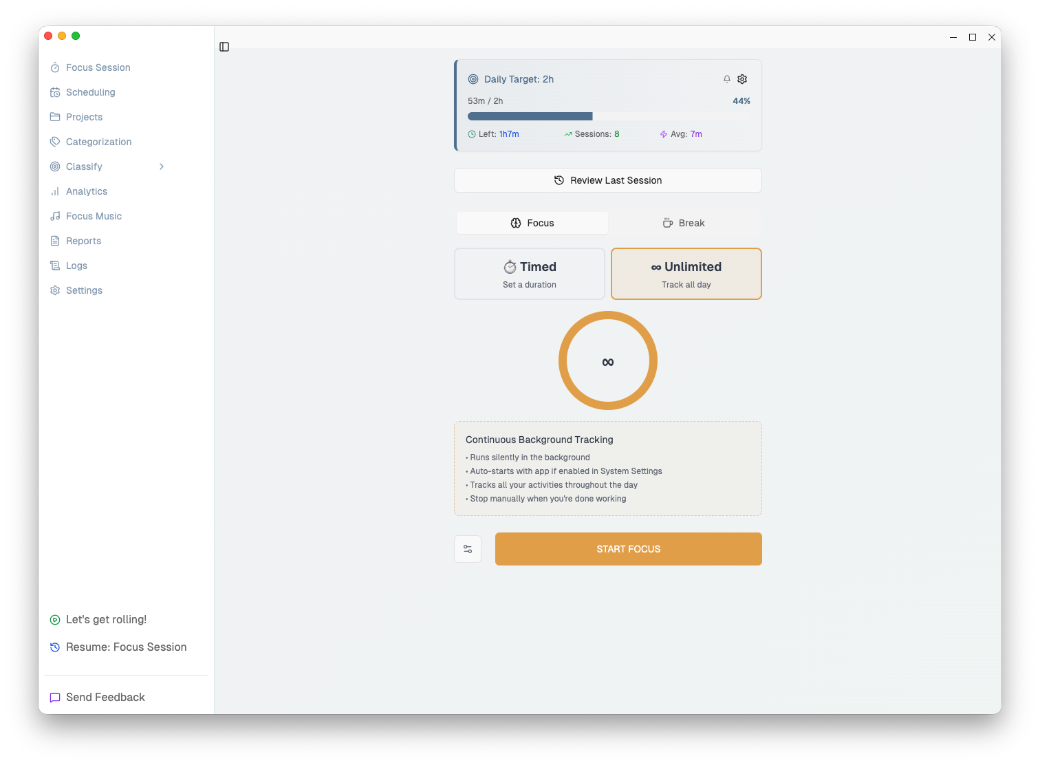 Clear mode selector: Choose between Timed sessions or Unlimited tracking